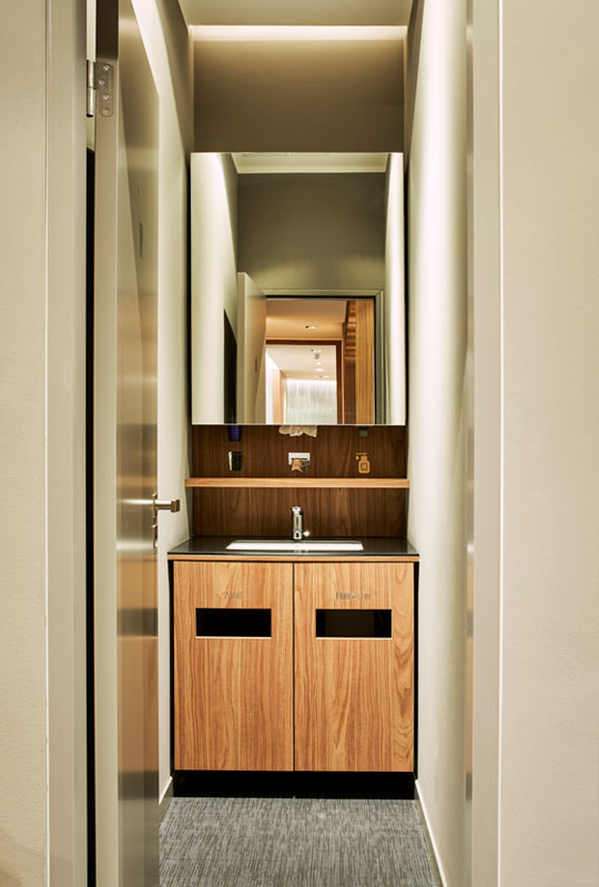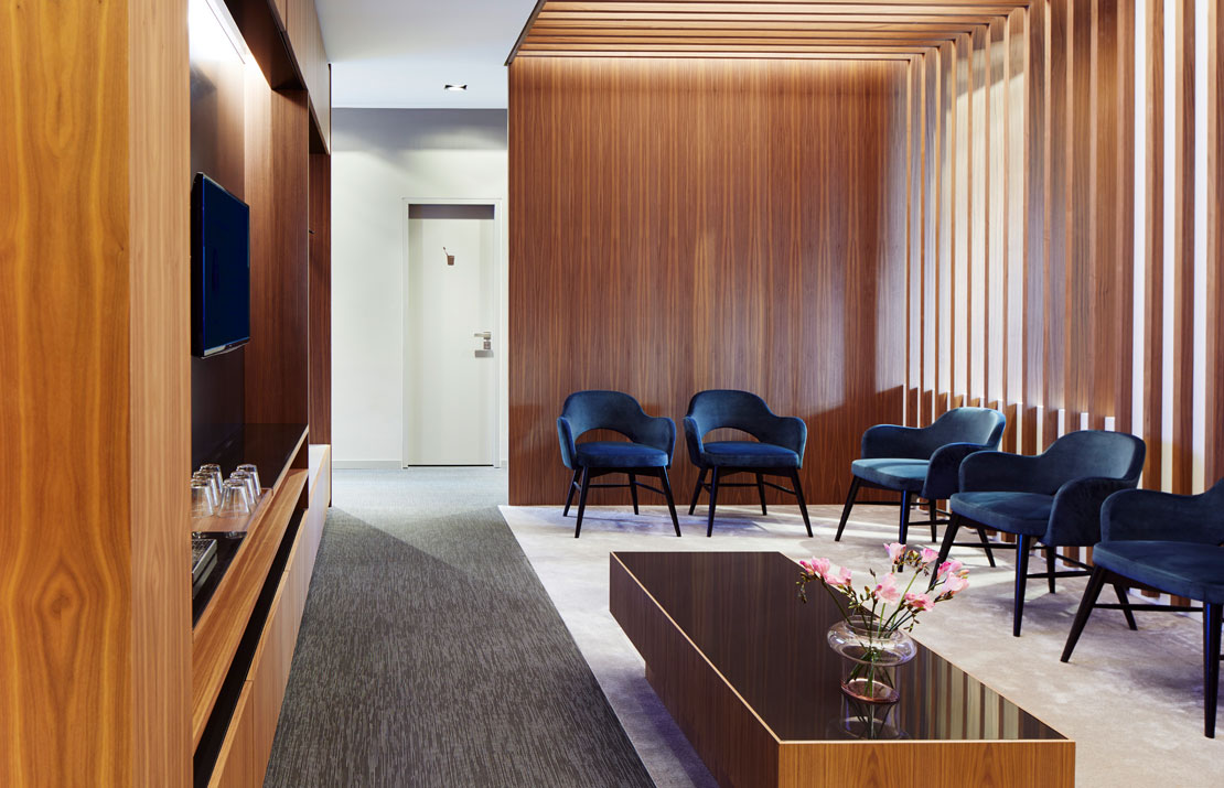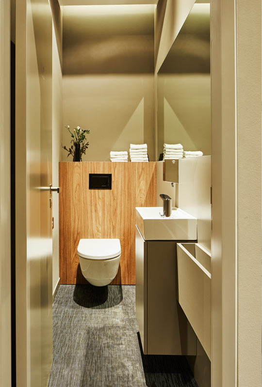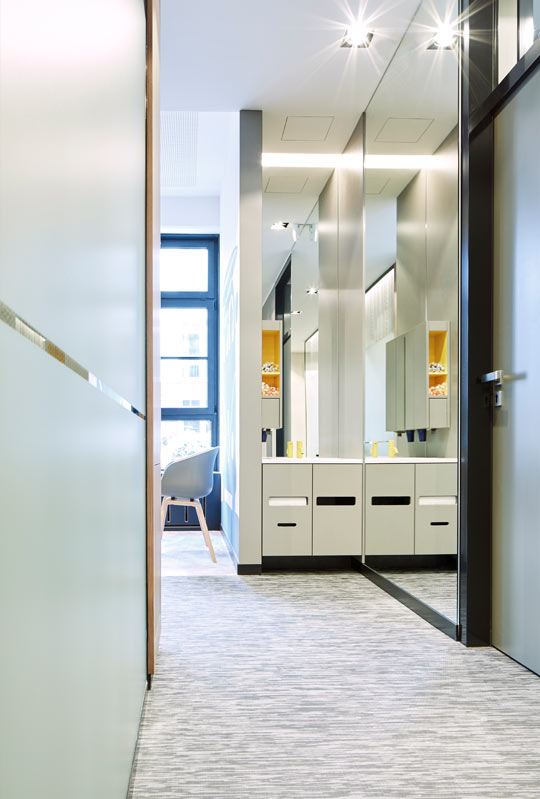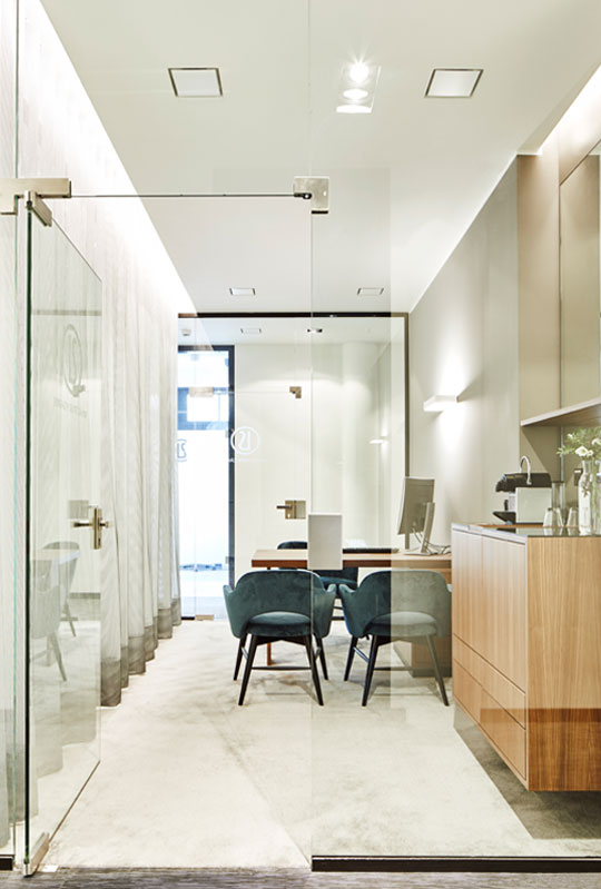 Durch geschickten Einsatz von Materialien und Beleuchtung entsteht eine warme, einladende Atmosphäre in den Warte- und Besprechungsräumen, die ein perfektes Gegengewicht zu den puristischen Arbeitsräumen bildet.