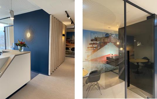 In hanseatischer Optik mit Containerwänden und großflächigen Fotos der Hafenszenerie kann die Zahnarztpraxis in Harburg seit Feb. 2021 wieder termingerecht Patienten empfangen.