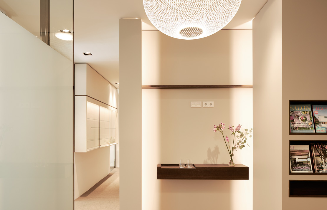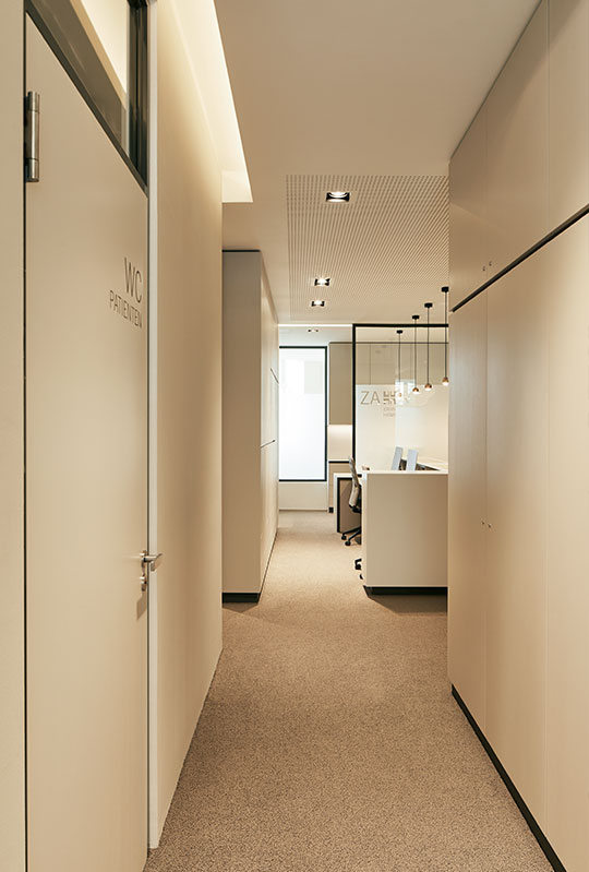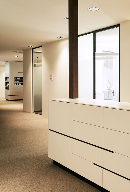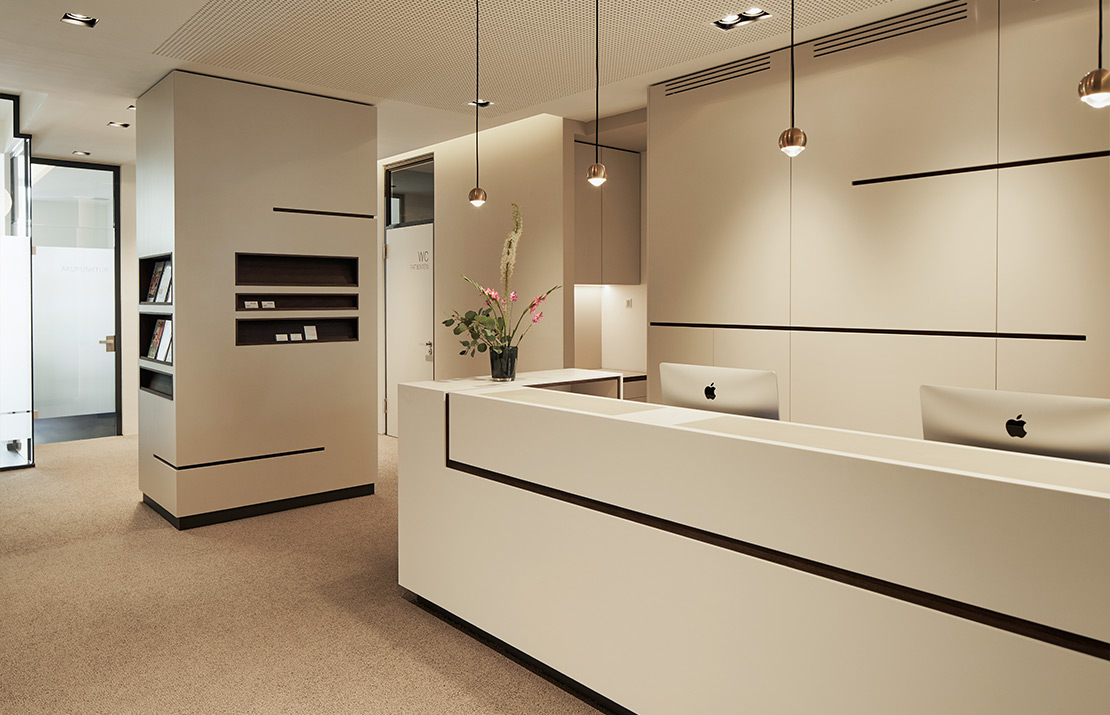 Der Umbau besticht in erster Linie durch einen sehr hochwertigen Ausbau von Möbeln, die die Philosophie der bestehenden Praxis in einem neuen Antlitz wiederspiegeln lässt. Der Grundentwurf beinhaltet das Zusammenlegen der beiden Flächen in Form eines hochwertigen langen Alkovemöbels, welches die Flächen verbindet und vereint.