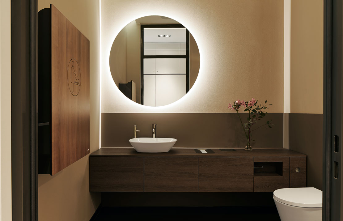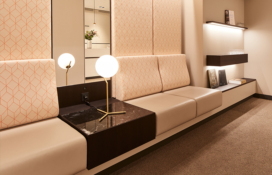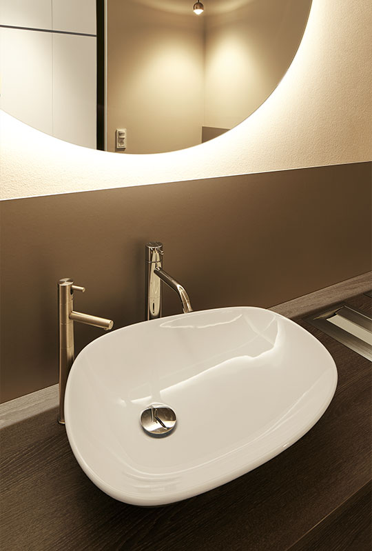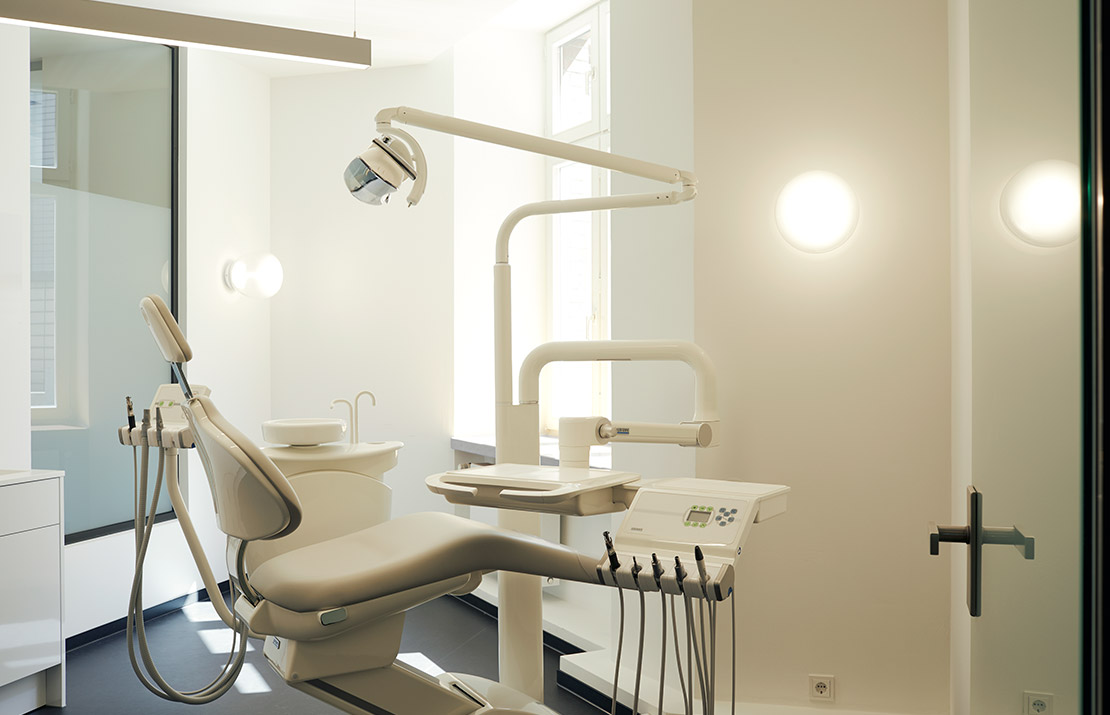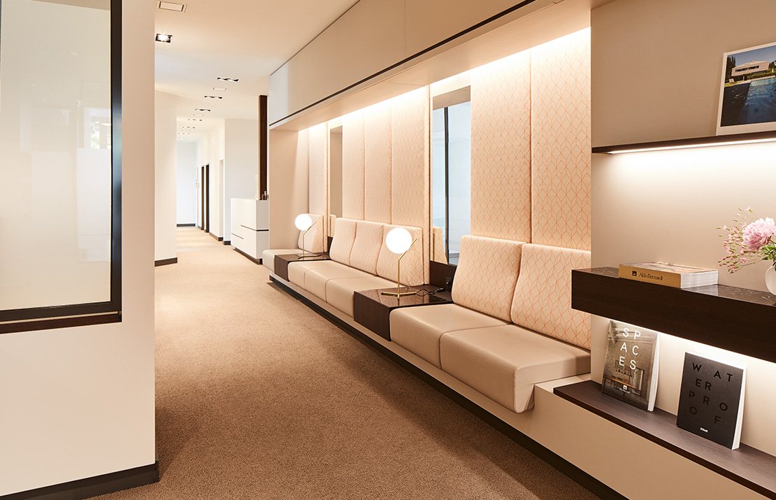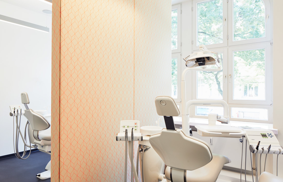 Die Vereinigung zieht sich optisch durch horizontale Linien aus elegantem Furnier durch sämtliche Möbel der Praxis. Gleichzeitig trennt die gut durchdachte Anordnung der Möblierung die einzelnen Bereiche (Empfang, Wartebereiche (Prophylaxe & Behandlung) sowie die Personal- und Laborbereiche) klar voneinander.