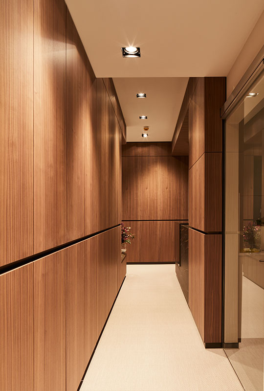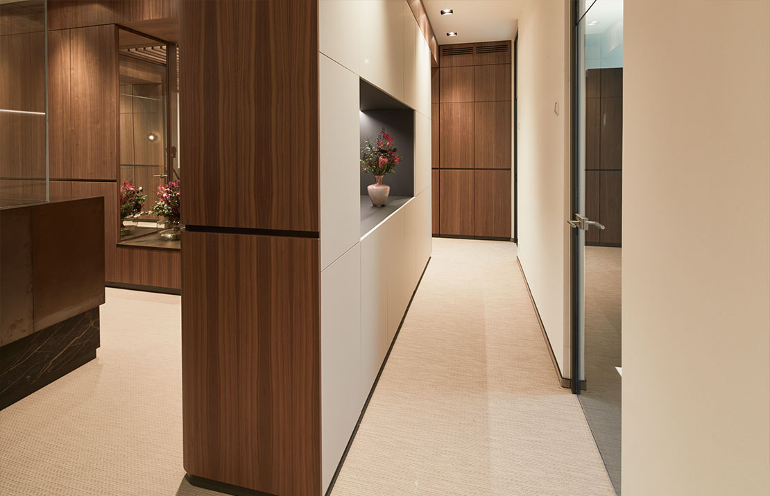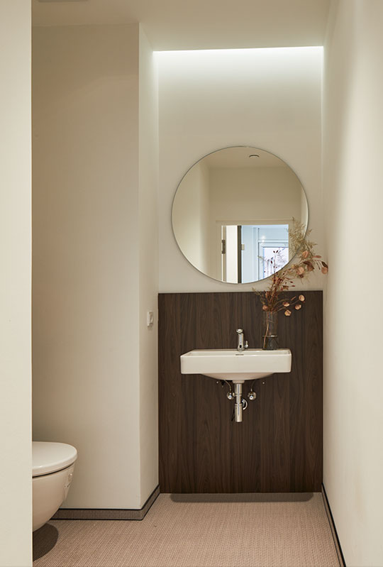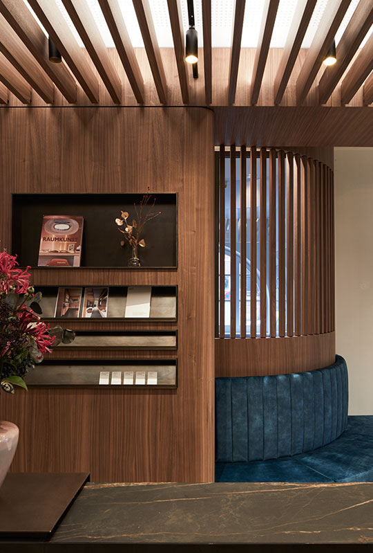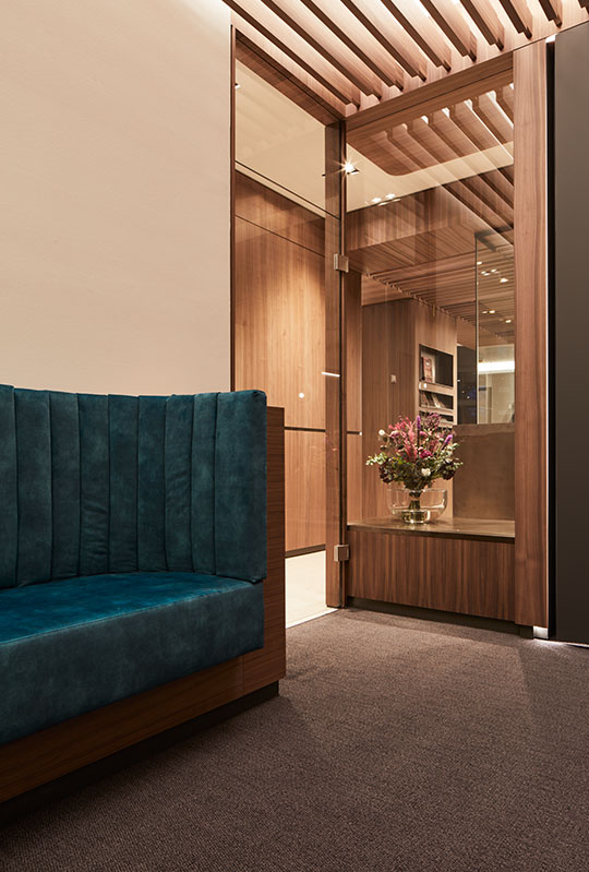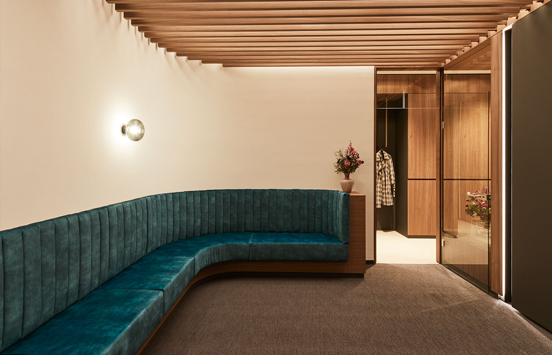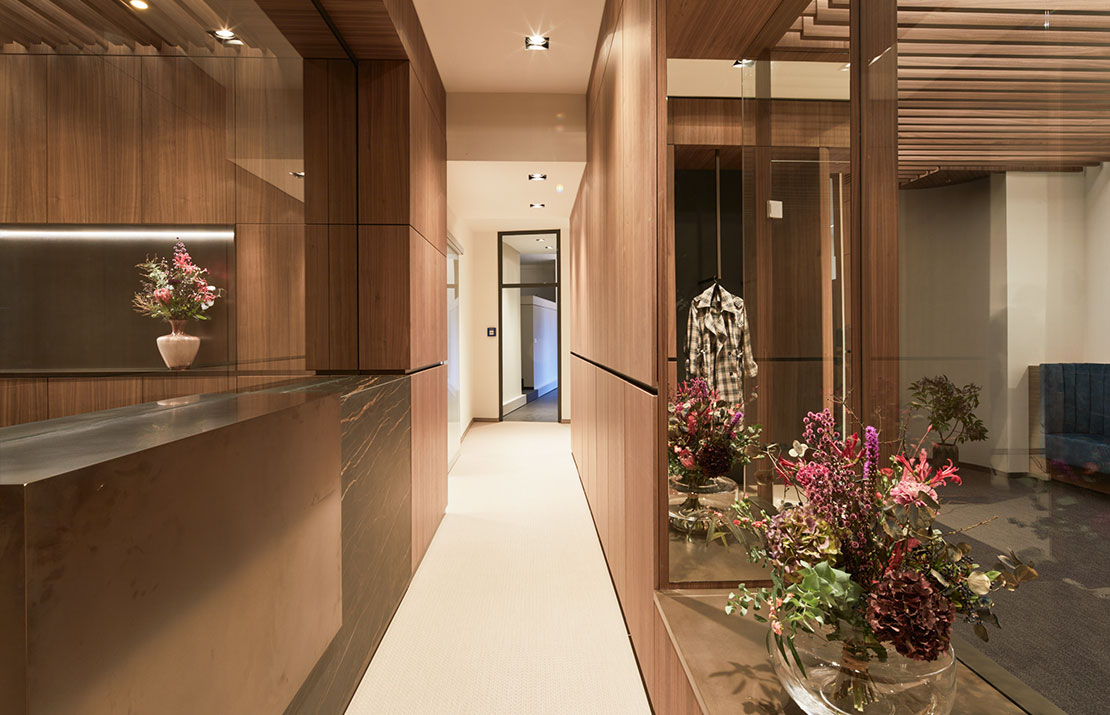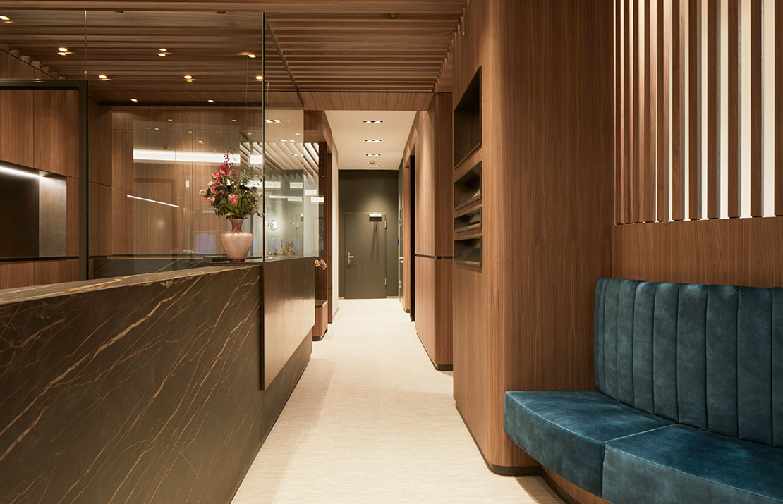 Marmor und Holzstruktur bringen die Natur in die Räume, Glas und Durchbrüche sorgen für Weite. Das indirekte Licht erzeugt Wärme und perfektioniert die Wohlfühlatmosphäre in den Räumlichkeiten.